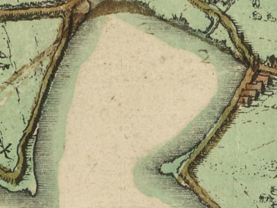 Kaart linksonder: Op de ingekleurde kaart van Pieter Cornelisz. Cort in het Nationaal Archief heeft iemand bij Avenhorn drie tweegangen aangegeven.
